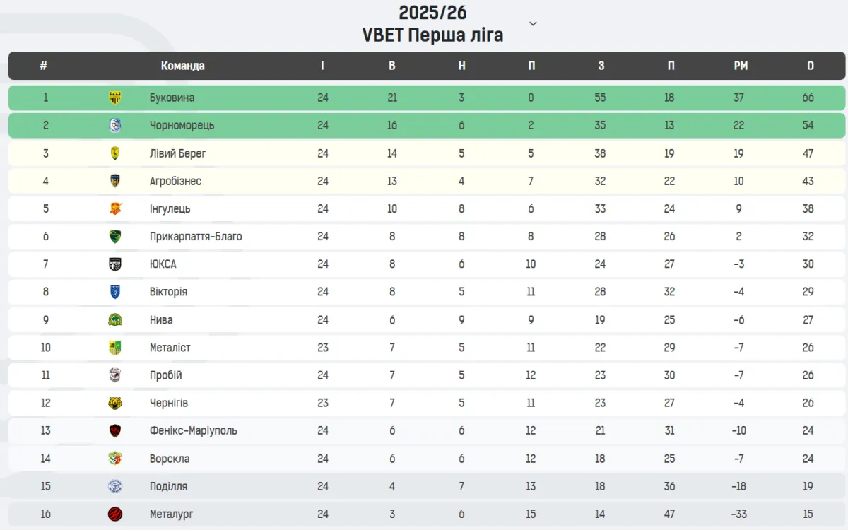 Буковина вже в статусі учасника УПЛ сезону 2026/27 продовжує очолювати турнірну таблицю Першої ліги. Чорноморець, який іде другим, за підсумками туру зумів відірватися від третього Лівого Берега. Тепер відстань між клубами становить сім очок.