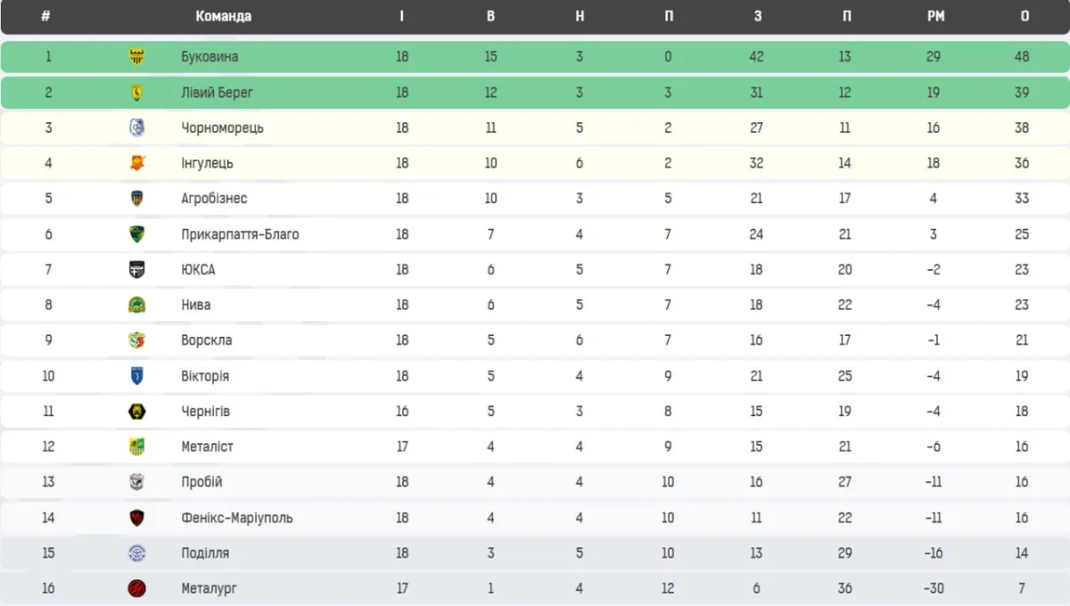 За підсумками 18 турів лідером є Буковина (Чернівці), команда Сергія Шищенка набрала 48 очок у 18 матчах. Другим зараз йде київський Лівий Берег з 39 балами після аналогічної кількості зустрічей, а трійку замикає одеський Чорноморець (38 очок).