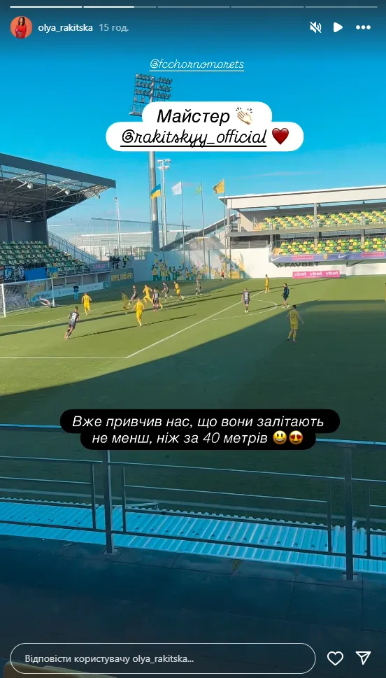 Центральний захисник Чорноморця Ярослав Ракицький відзначився шедевральним голом у матчі Першої ліги. Ольга Ракицька, його дружина, відреагувала на цей забитий м'яч.
