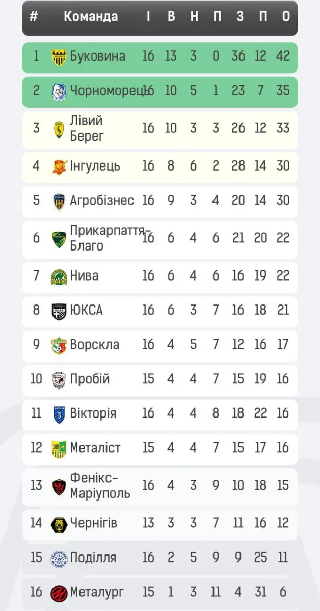 17 листопада завершився 16-й тур Першої ліги. Таким чином, стало відомо оновлене положення команд в таблиці другого за силою дивізіону українського футболу.