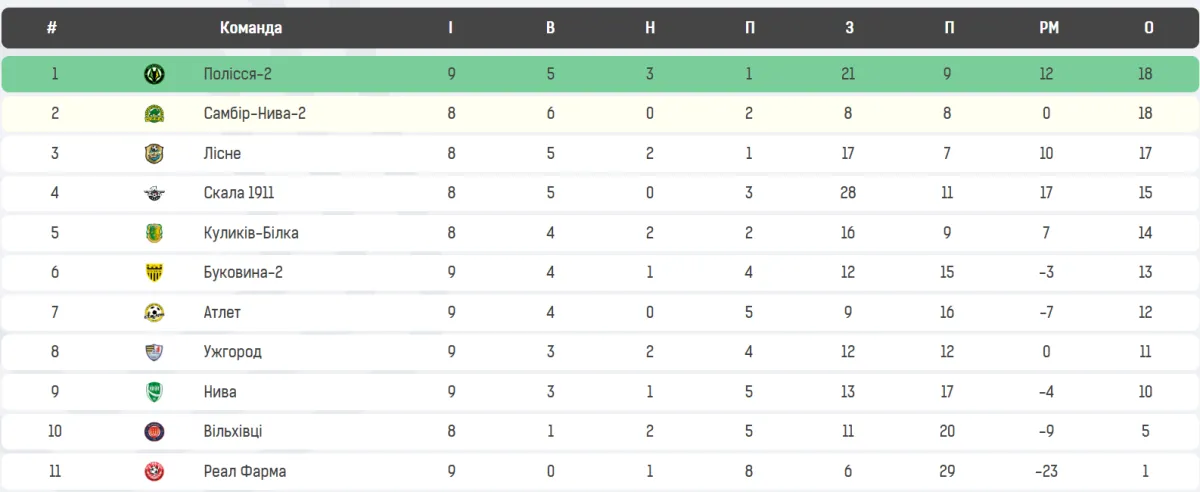 - Буковина-2 поки шоста з 13 очками в дев'яти поєдинках. Полісся-2 наразі лідирує з 18 балами в дев'яти іграх.