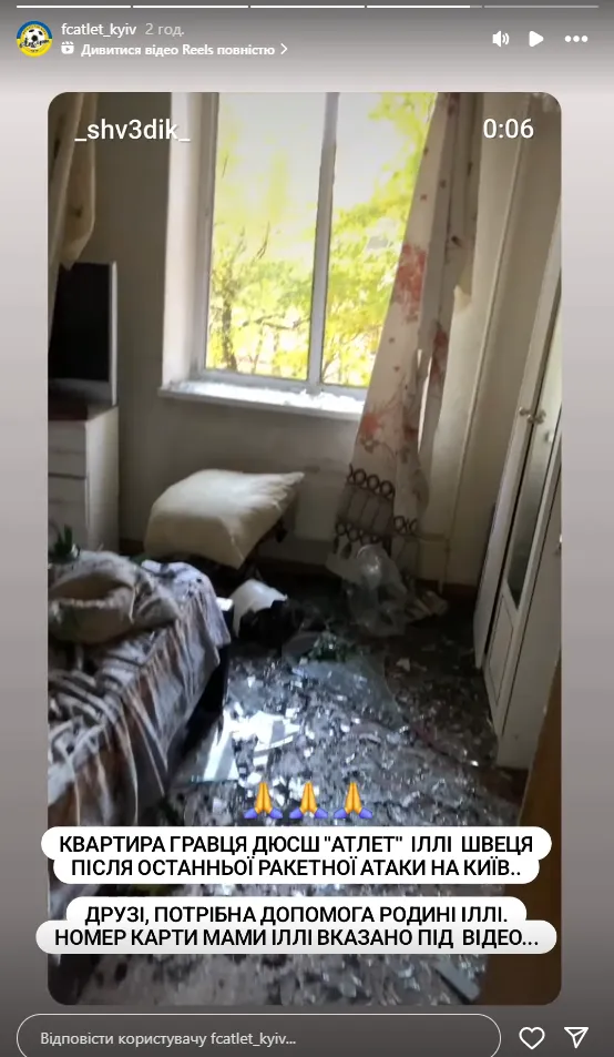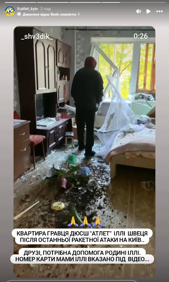 В наслідок влучання дрону футболіст та члени його родини вижили, але їх квартира потребує ремонту, а родина фінансової допомоги.