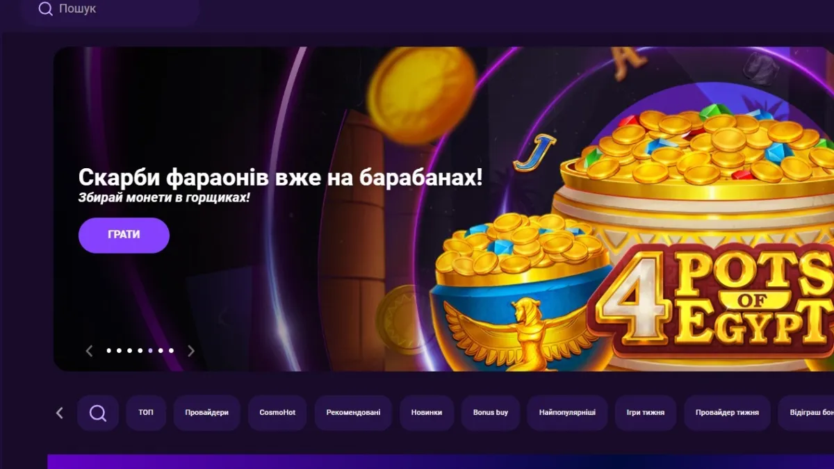 Cosmolot – топове онлайн казино України на реальні гроші з мінімальним депозитом від 100 гривень та щедрими бонусами для нових гравців – 150 000 гривень та 550 спінів за реєстрацію з депозитом.