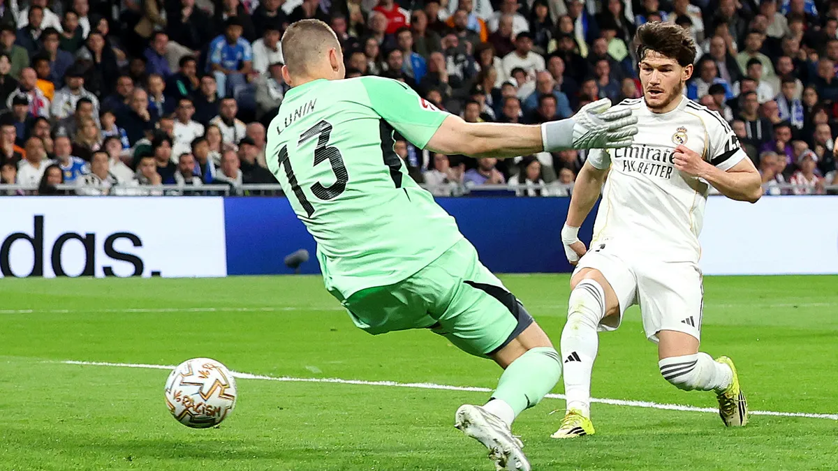 На старті зустрічі гравці Реала мали дві чудові можливості відкрити рахунок. Спершу голкіпер Атлетико Муссо потягнув удар Карвахаля, а згодом Вальверде влучив у стійку воріт суперника. А на десятій хвилині Лунін виручив команду, парирувавши удар Льоренте.