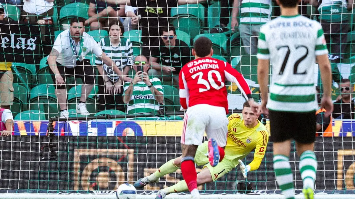 Анатолій Трубін тягне пенальті від Луїса Суареса. Фото: x.com/SLBenfica