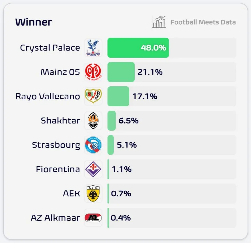 Беззаперечним фаворитом турніру вважається англійський Крістал Пелас. Аналітики дають лондонському колективу 48% на загальний успіх. На другій сходинці розташувався німецький Майнц із показником 21,1%, а трійку лідерів замикає іспанський Райо Вальєкано (17,1%).