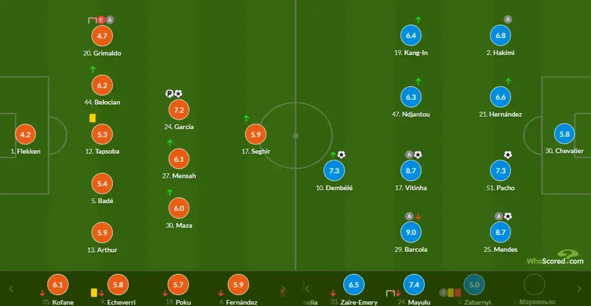 Захисник французького клубу Ілля Забарний розпочав матч у стартовому складі, проте був вилучений з поля на 37-й хвилині після двох порушень у власному штрафному майданчику, які призвели до двох пенальті на користь суперника.