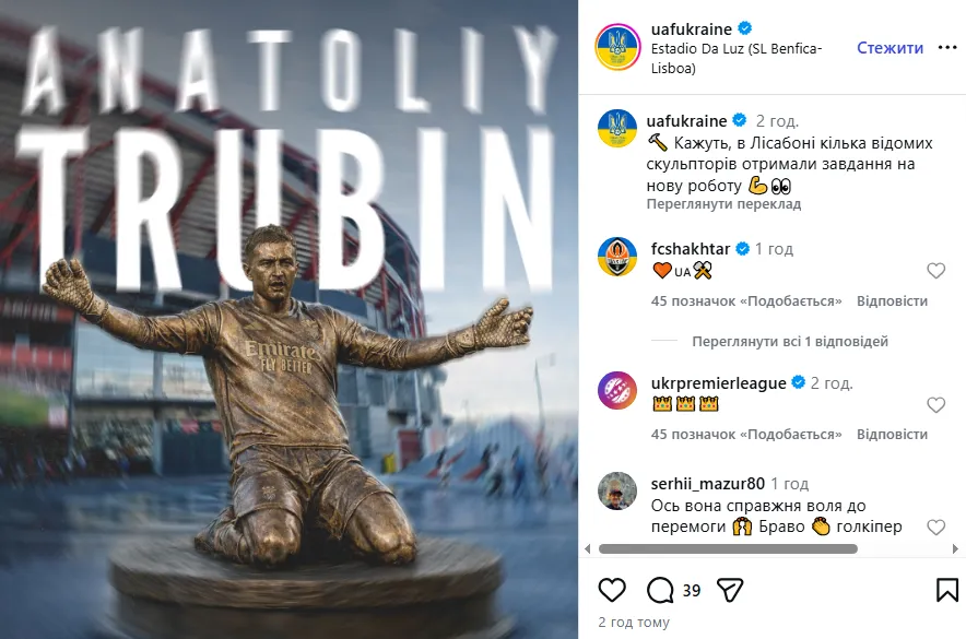 На офіційній сторінці УАФ в Instagram з'явився красномовний допис. На зображенні змодельовано золоту статую Анатолія Трубіна, який стоїть на колінах у тріумфальній позі на фоні домашньої арени Бенфіки – «Ештадіу да Луж».