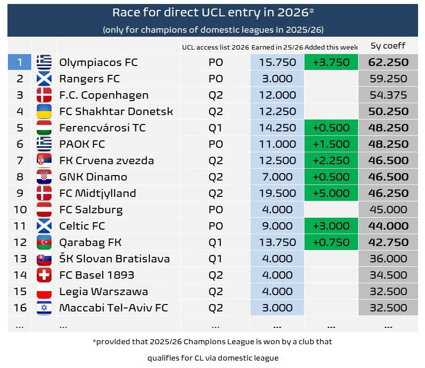 Нагадаємо, що окрім провалу Олімпіакоса потрібно, щоб Копенгаген і Рейнджерс не пробилися до Ліги чемпіонів через чемпіонат, або якщо Шахтар випередить їх у клубному рейтингу, за умови, що решта команд не зможе перевершити команду Арди Турана.