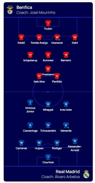 Головні тренери команд Жозе Моурінью та Альваро Арбелоа визначилися зі складами на зустріч. У Бенфіки у стартовому складі вийде український голкіпер Анатолій Трубін, а півзахисник Георгій Судаков перебуватиме у запасі.