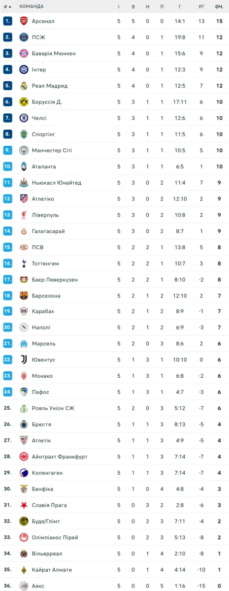 Турнірна таблиця Ліги чемпіонів після п’ятого туру