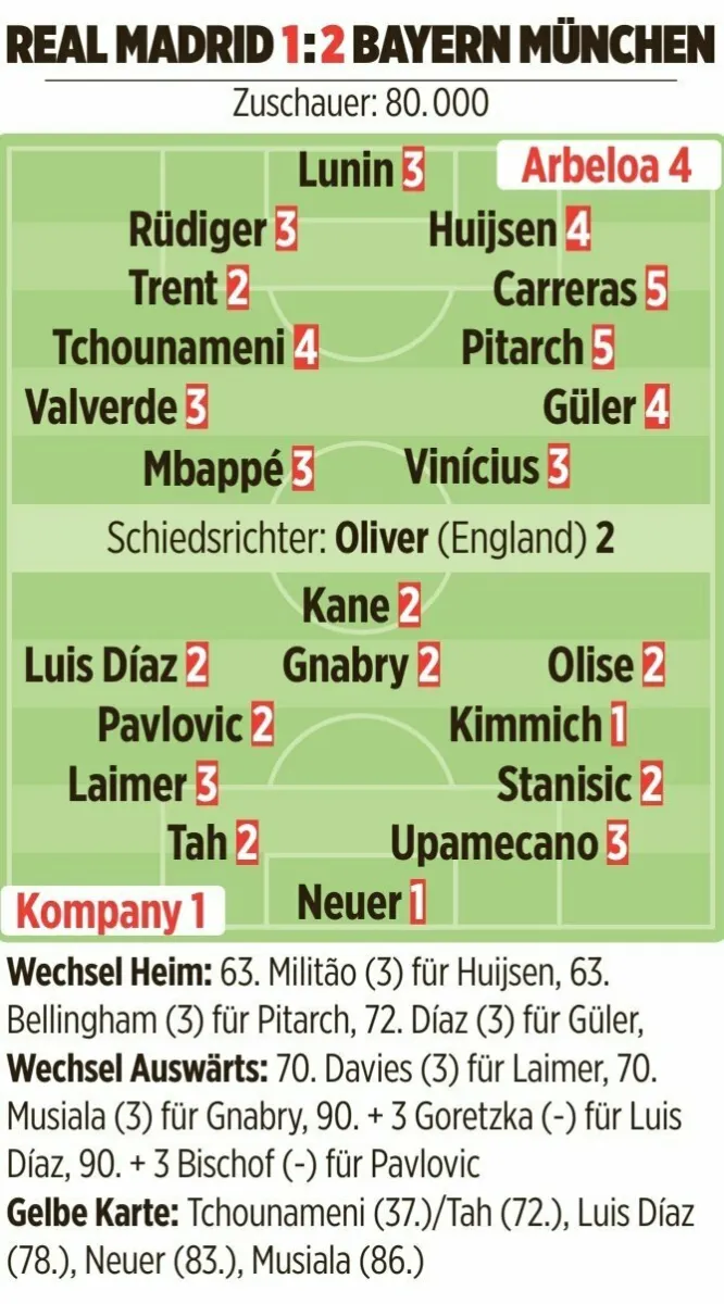 Німецьке видання Bild визнало найкращим гравцем у складі Реалу захисника Трента Александера-Арнольда, який отримав два бали (де один максимальна оцінка, а шість мінімальна).