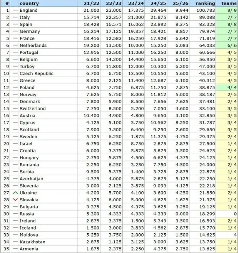 Таблиця коефіцієнтів УЄФА (топ-35)