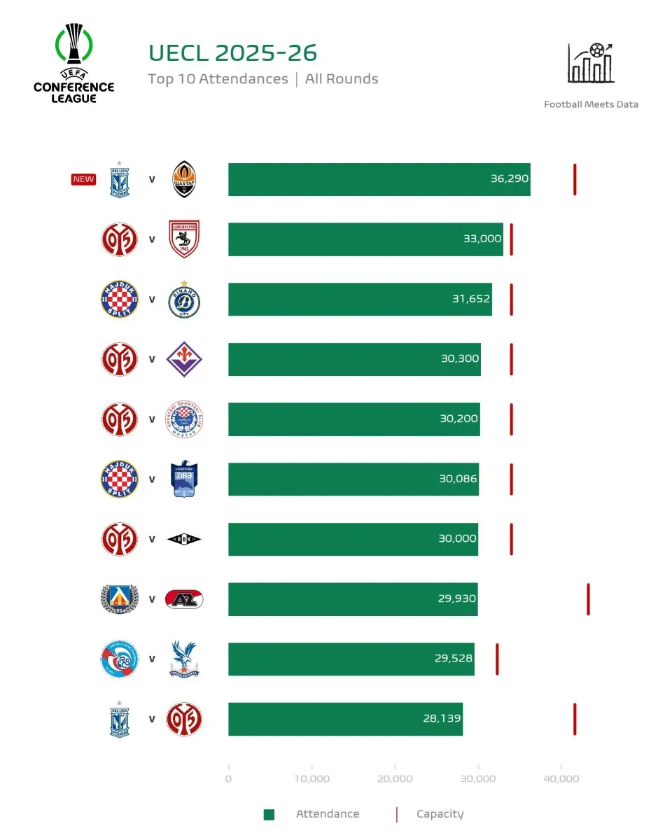 Перший матч 1/8 фіналу Ліги конференцій між польським Лехом і донецьким Шахтарем (1:3) встановив рекорд сезону за відвідуваністю у Лізі конференцій.