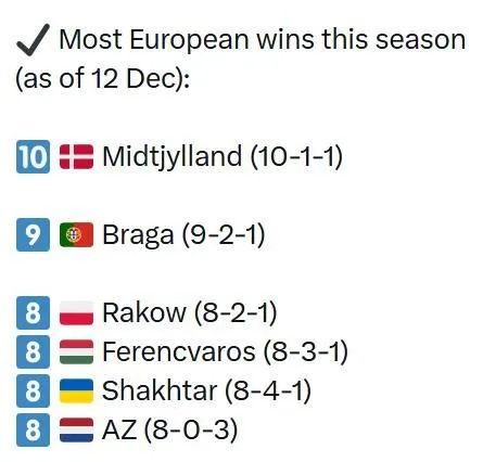 За даними Football Meets Data, лідером сезону за кількістю перемог у всіх стадіях кваліфікації та основних раундах єврокубків є данський Мітьюллан, адже у нього десять успішних поєдинків. На другому місці розташовується португальська Брага з дев'ятьма перемогами. Третю позицію спільно займають Шахтар, польський Ракув, угорський Ференцварош та нідерландський АЗ.