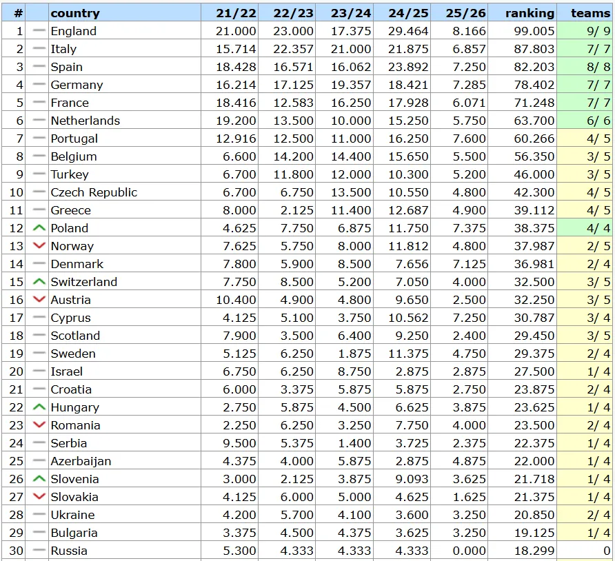 Варто відзначити, що 28-30 місце за підсумками сезону означатиме старт чемпіона України у першому кваліфікаційному раунді Ліги чемпіонів з сезону 2027/28. Зараз перша команда України розпочинає шлях у ЛЧ з другого раунду.