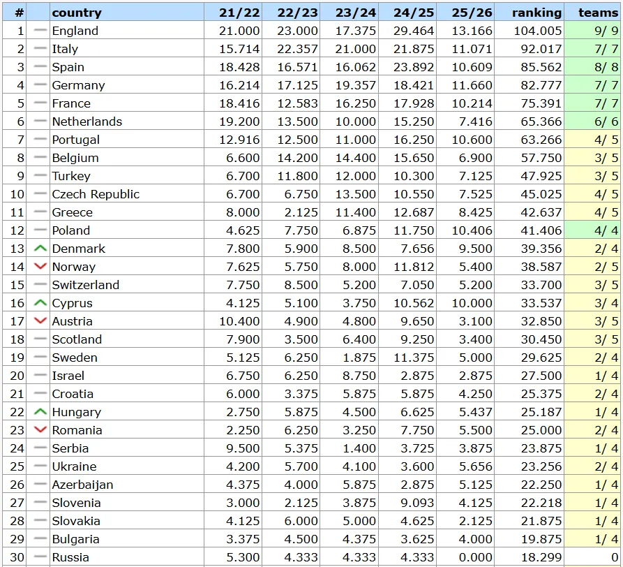 В турнірній таблиці коефіцієнтів УЄФА Україна нині посідає 25-те місце. Бали для країни на цьому тижні заробив тільки Шахтар: