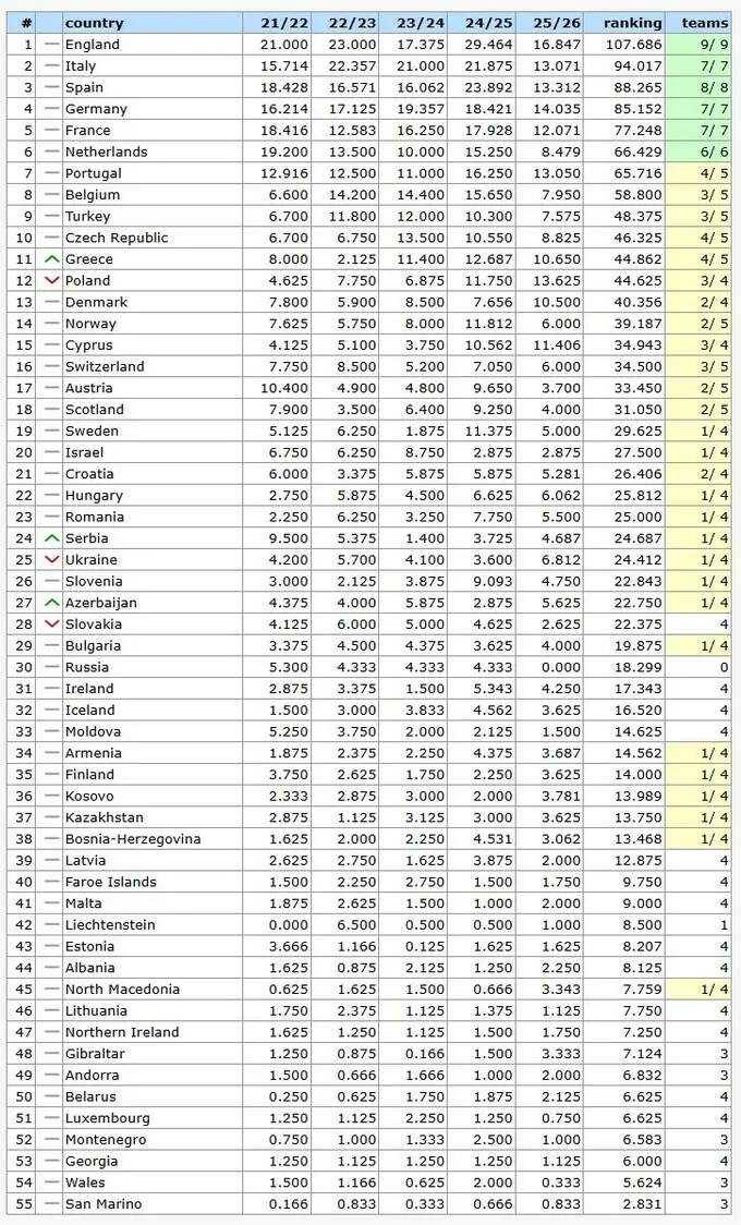 Таблиця коефіцієнтів УЄФА станом на 24 січня 2026 року
