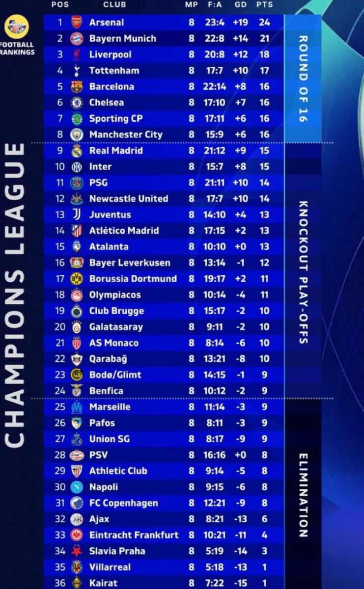 Турнірна таблиця Ліги чемпіонів після восьмого туру