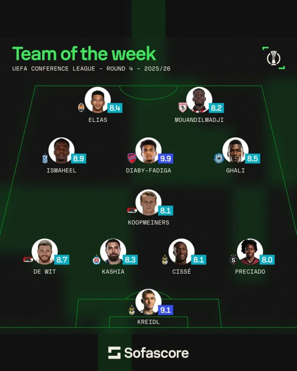 Аналітики авторитетного порталу Sofascore за підсумками поєдинків четвертого туру основного етапу Ліги конференцій сформували символічну команду тижня.