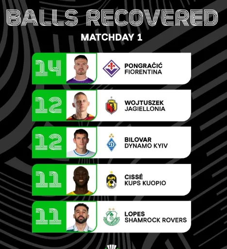 Центральний захисник київського Динамо Крістіан Біловар опинився в п’ятірці найкращих футболістів Ліги конференцій за підсумками першого туру за кількістю повернень володіння м’яча.