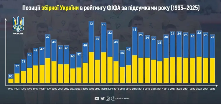 Якщо подивитися ширше, позиція наприкінці 2025-го вкладається в доволі стійкий тренд останніх років. Україна вже вчетирнадцяте поспіль розпочинає новий рік у топ-50 підсумкового рейтингу ФІФА, а також увосьме поспіль тримається серед 30 найкращих збірних планети. Така серія свідчить, що навіть за різних поколінь футболістів і змін тренерських підходів команда зберігає конкурентність на міжнародному рівні, регулярно набирає очки в офіційних матчах і не провалюється в рейтингу на дистанції.