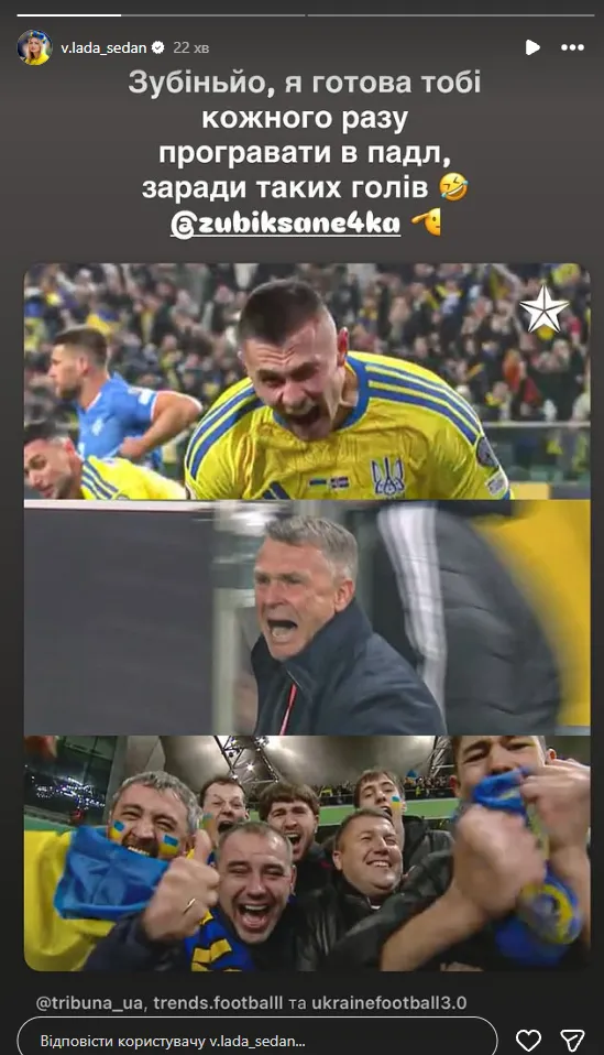 На цей тріумф, який принесли голи Олександра Зубкова та Олексія Гуцуляка, відреагувала ціла низка популярних в Україні персон. Наприклад, Влада Седан, дружина гравця національної команди Олександра Зінченка, на своїй сторінці у соцмережі Instagram відзначила Зубкова.