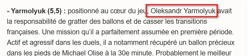 Відомий французький портал Foot Mercato, розбираючи виступ півзахисника збірної України і Брентфорда Єгора Ярмолюка, написав не його ім’я. Замість Єгор журналісти назвали його Олександр. 21-річний гравець вийшов у старті і зіграв 85 хвилин.