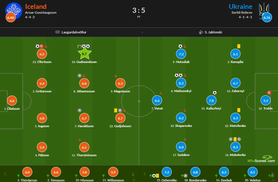 Статистичний ресурс WhoScored опублікував оцінки гравців після матчу кваліфікації ЧС-2026 між збірними Ісландії та України, що завершився видовищною перемогою синьо-жовтих з рахунком 5:3.