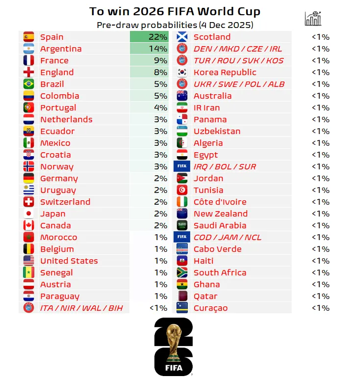 Таким чином стало відомо, що найвірігоднішим переможцем є чинний чемпіон Європи – збірна Іспанії, шанси якої оцінюють у 22%. Другим найімовірнішим переможцем вважають збірну Аргентини, яка є чинним чемпіоном світу – їй відводять 14% на успіх на Мундіалі в США, Мексиці та Канаді.