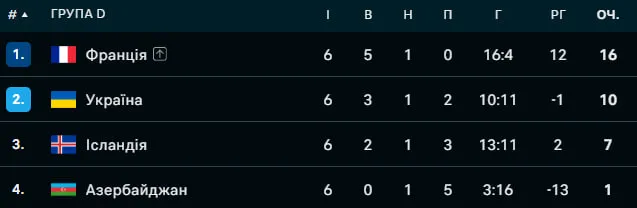 Збірна України провела вирішальний матч відбору до ЧС-2026 проти Ісландії. Показуємо, як виглядає турнірна таблиця групи D після завершення шести турів.