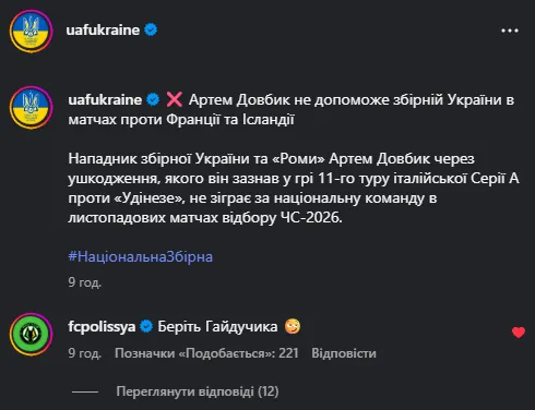 Адміністратори офіційного акаунту житомирського Полісся у соціальній мережі Instagram порадили головному тренеру національної збірної України Сергію Реброву, ким замінити у його команді травмованого нападника італійської Роми Артема Довбика.