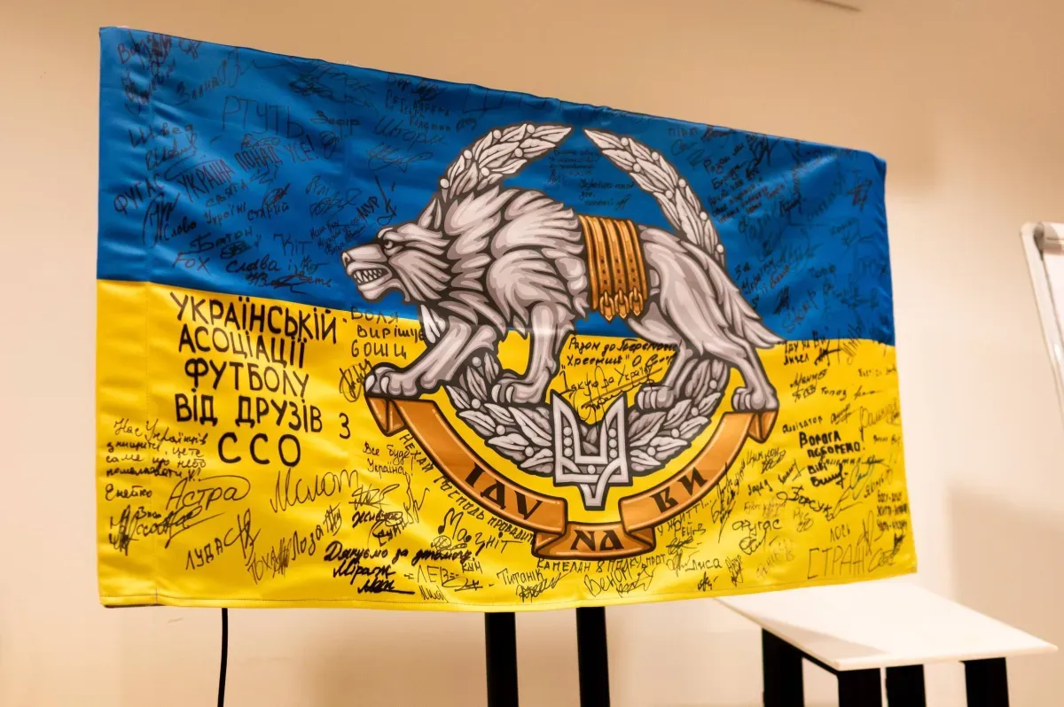 На стіні приміщення розмістили прапор Сил спеціальних операцій Збройних сил України, на якому багато підписів і девіз ССО.