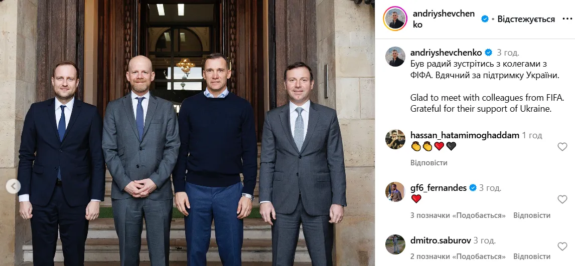 Шевченко виклав відповідний пост у власному Instagram, прикріпивши світлини з представниками ФІФА.