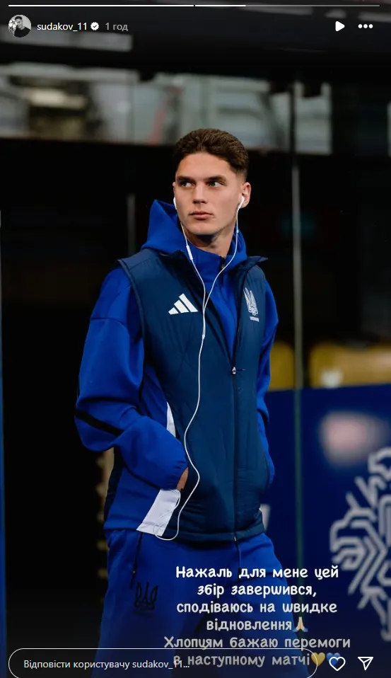 «На жаль для мене цей збір завершився, сподіваюсь на швидке відновлення. Хлопцям бажаю перемоги в наступному матчі», – написав Судаков.