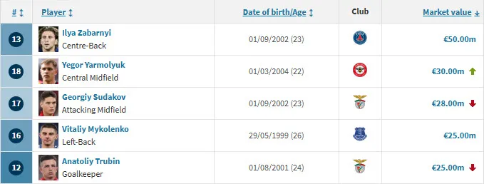 П'ятірка ж найдорожчих гравців збірної України виглядає так. Вона дещо здешевшала через втрату в ціні гравців Бенфіки Георгія Судакова й Анатолія Трубіна: