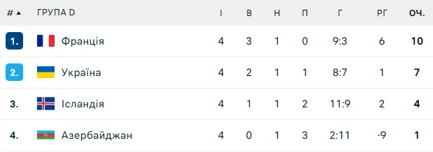Збірна України зіграє у листопаді вирішальні матчі з Францією та Ісландією у відборі чемпіонату світу 2026. Відомо, як виглядає турнірна таблиця групи станом на зараз.