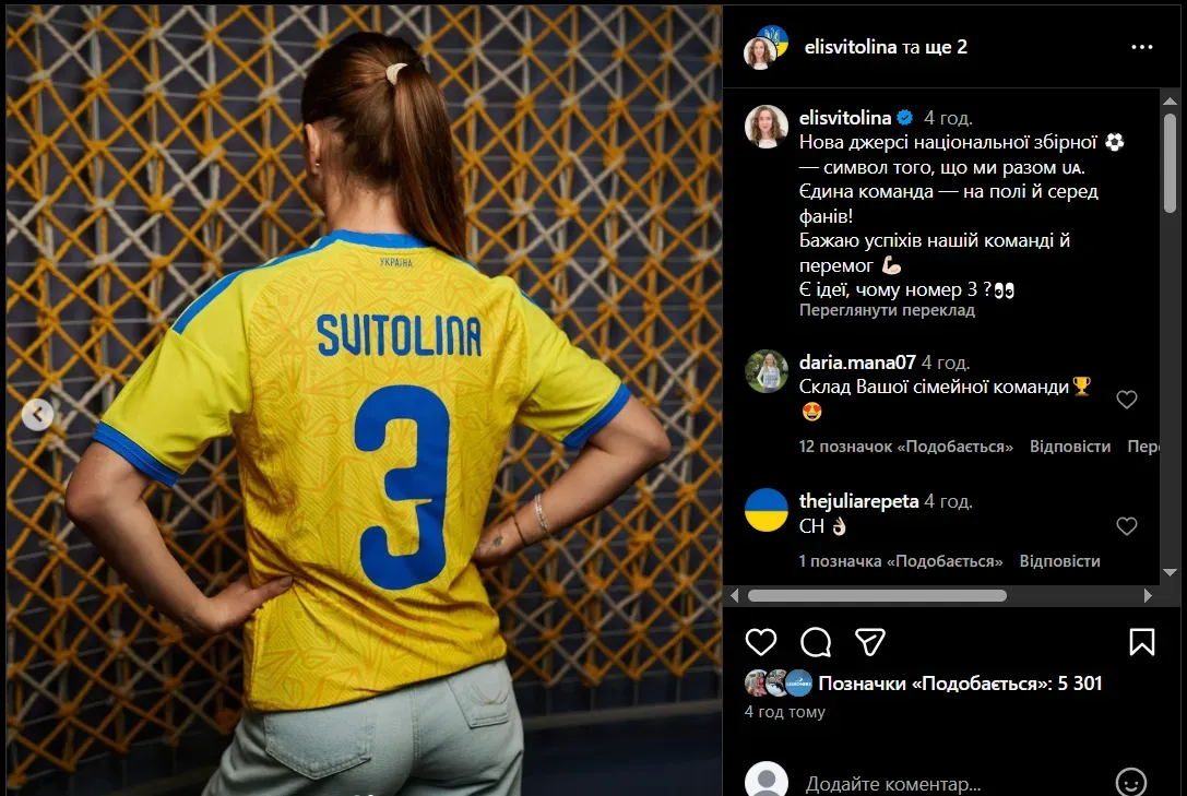 «Нова джерсі національної збірної – символ того, що ми разом. Єдина команда – на полі й серед фанів! Бажаю успіхів нашій команді й перемог. Є ідеї, чому номер 3?», – написала Світоліна на власній сторінці в Instagram.