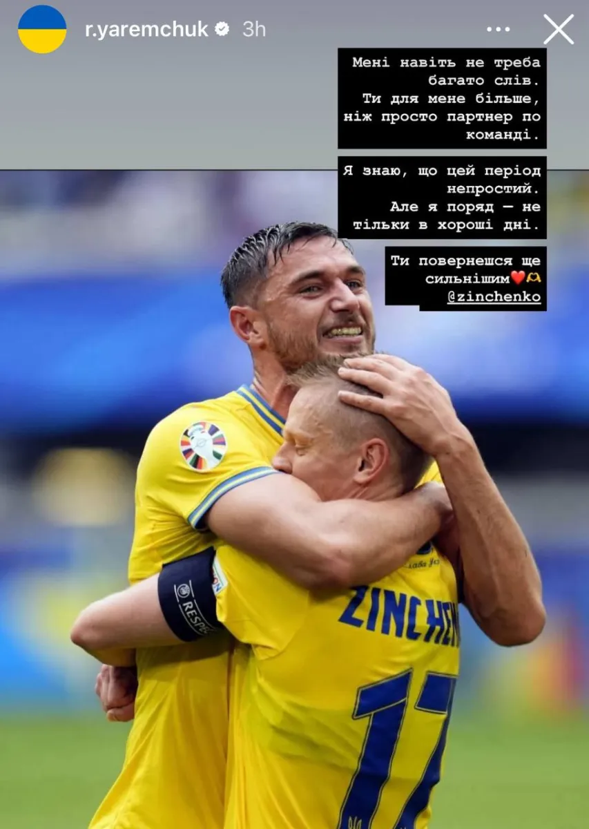 «Мені навіть не треба багато слів. Ти для мене більше, ніж просто партнер по команді. Я знаю, що цей період непростий. Але я поряд – не тільки в хороші дні. Ти повернешся ще сильнішим», – написав Яремчук в Instagram.