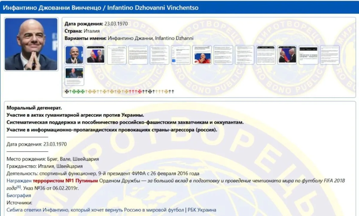 Президент ФІФА Джанні Інфантіно після останніх заяв щодо повернення рф в міжнародний футбол потрапив до бази центру «Миротворець».
