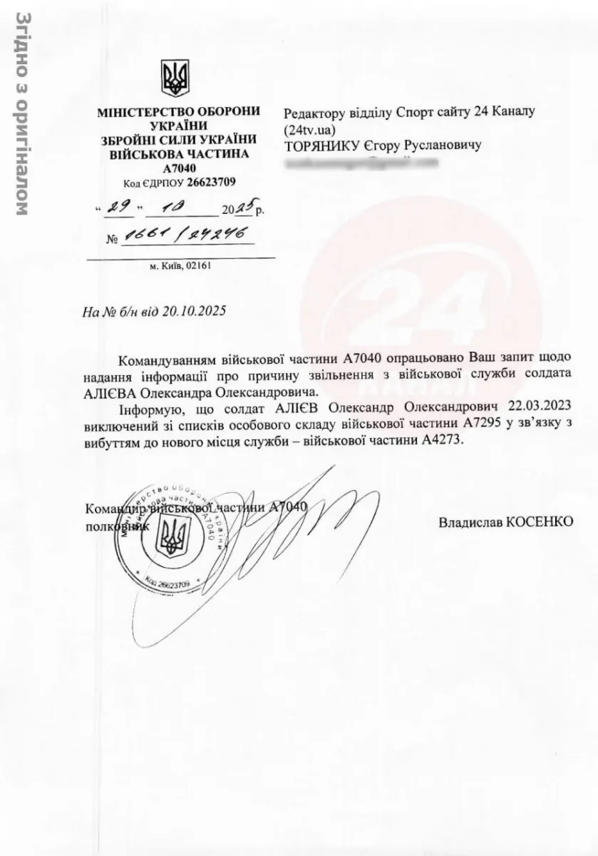 Офіційна відповідь 112-ї бригади щодо звільнення Алієва. Фото: «Канал 24»