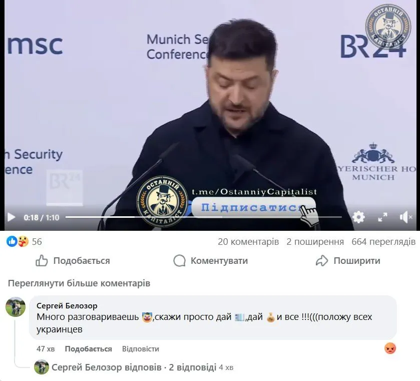 Ексгравець одеського Чорноморця та донецького Металурга Сергій Білозор, за інформацією UA-Football, прокоментував відеозвернення президента України Володимира Зеленського, написавши текст російською мовою: