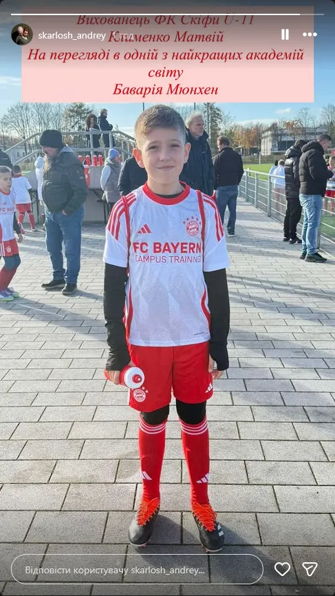 «Вихованець ФК Скіфи U-11 Клименко Матвій на перегляді в одній з найкращих академій світу – Баварія Мюнхен», – написав Скарлош у своєму інстаграмі.
