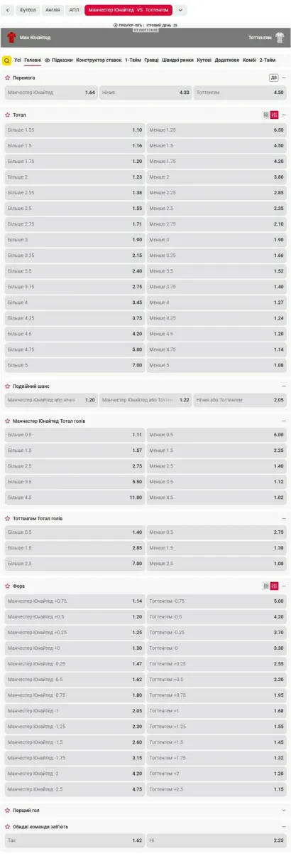 Лінія та коефіцієнти на матч Манчестер Юнайтед – Тоттенхем