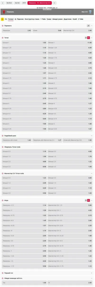 Лінія та коефіцієнти на матч Ліверпуль – Манчестер Сіті