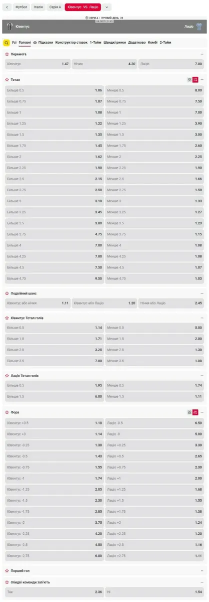 Лінія та коефіцієнти на матч Ювентус – Лаціо