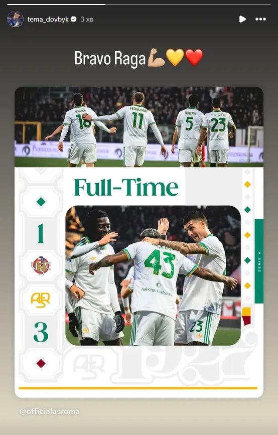 Український нападник Артем Довбик не зумів зіграти за Рому у матчі проти Кремонезе, однак привітав партнерів з гостьовою перемогою у Серії А.