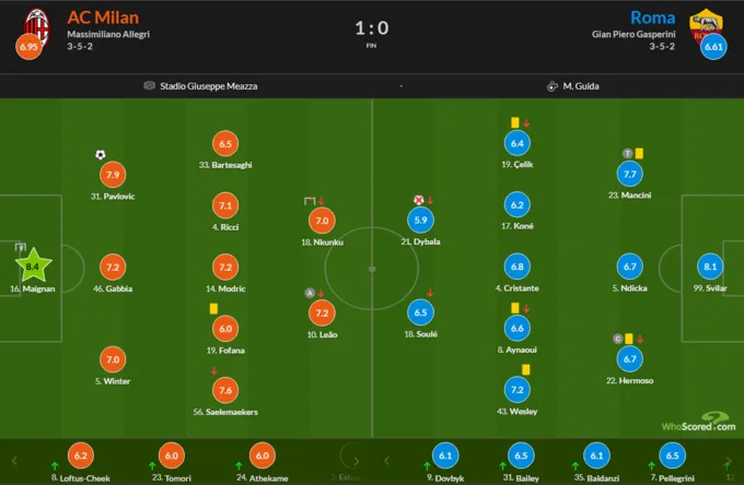 Найкращим гравцем зустрічі за версією обох платформ став голкіпер Мілана Майк Меньян. Француз відбив пенальті від Пауло Дібали і зробив сім сейвів, отримавши оцінки 8,2 та 8,4 бала.