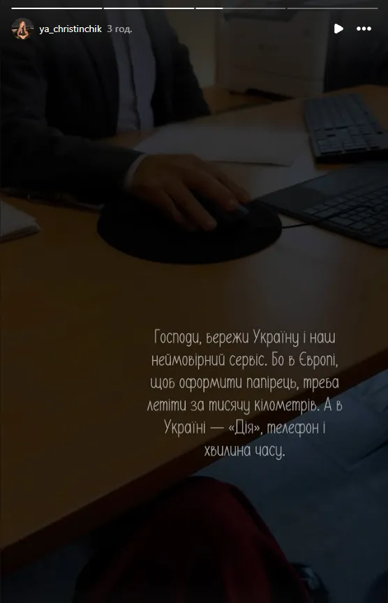 «Господи, бережи Україну і наш неймовірний сервіс. Бо в Європі, щоб оформити папірець, треба летіти за тисячу кілометрів. А в Україні – «Дія», телефон і хвилина часу», – написала панянка на своїй сторінці у соціальній мережі Instagram.