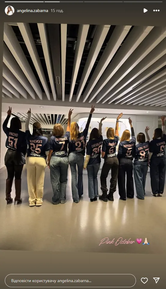 Ангеліна Забарна, дружина центрального захисника ПСЖ Іллі Забарного, разом з обраницям інших футболістів парижан сфотографувалася у спеціальній футболці.